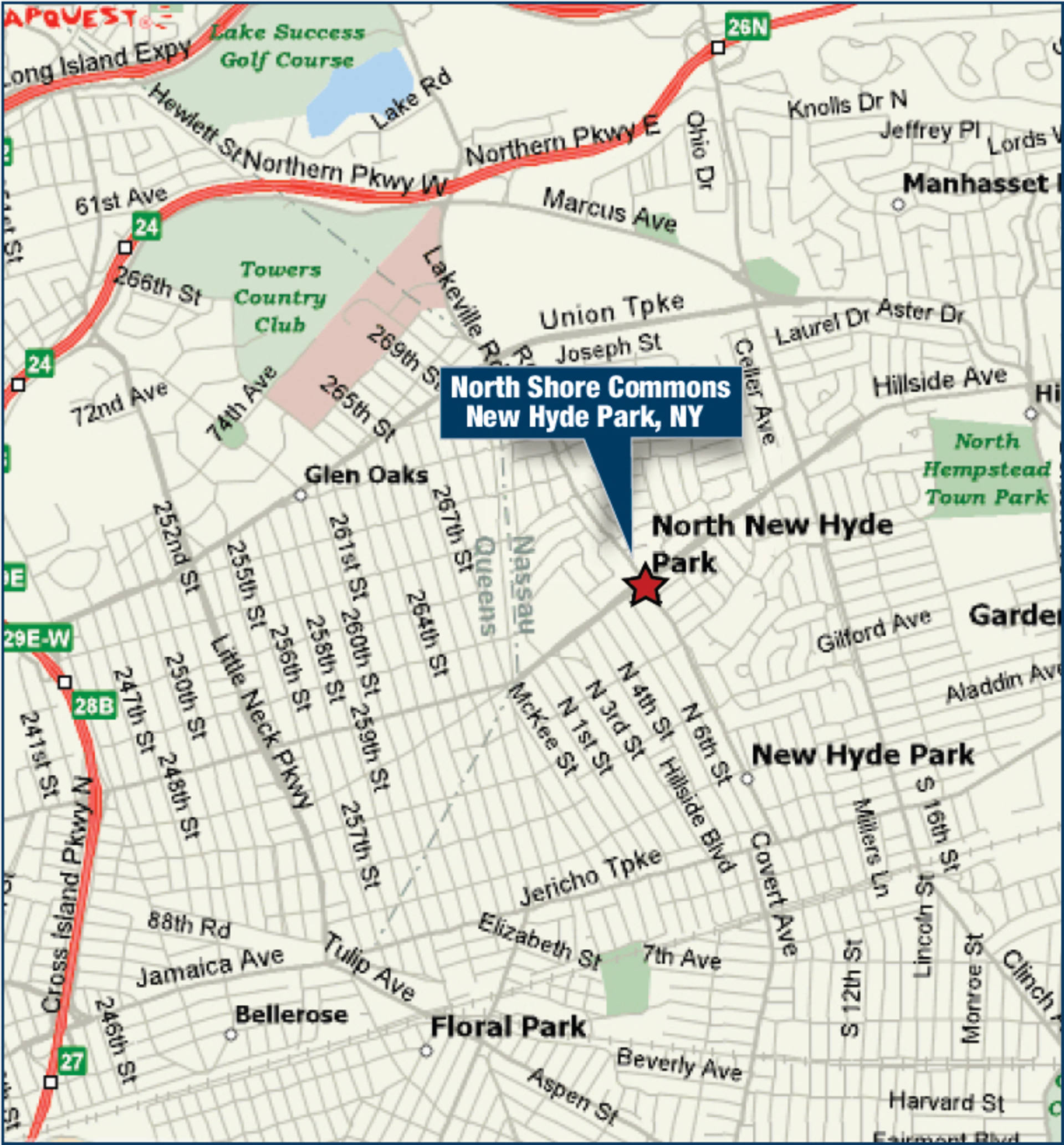 - North Shore Commons is located on the north/east corner of Hillside Avenue and Lakeville Road, 1/2 mile south of Long Island Jewish Hospital in western Nassau County, and 1/2 mile east of the Queens border.